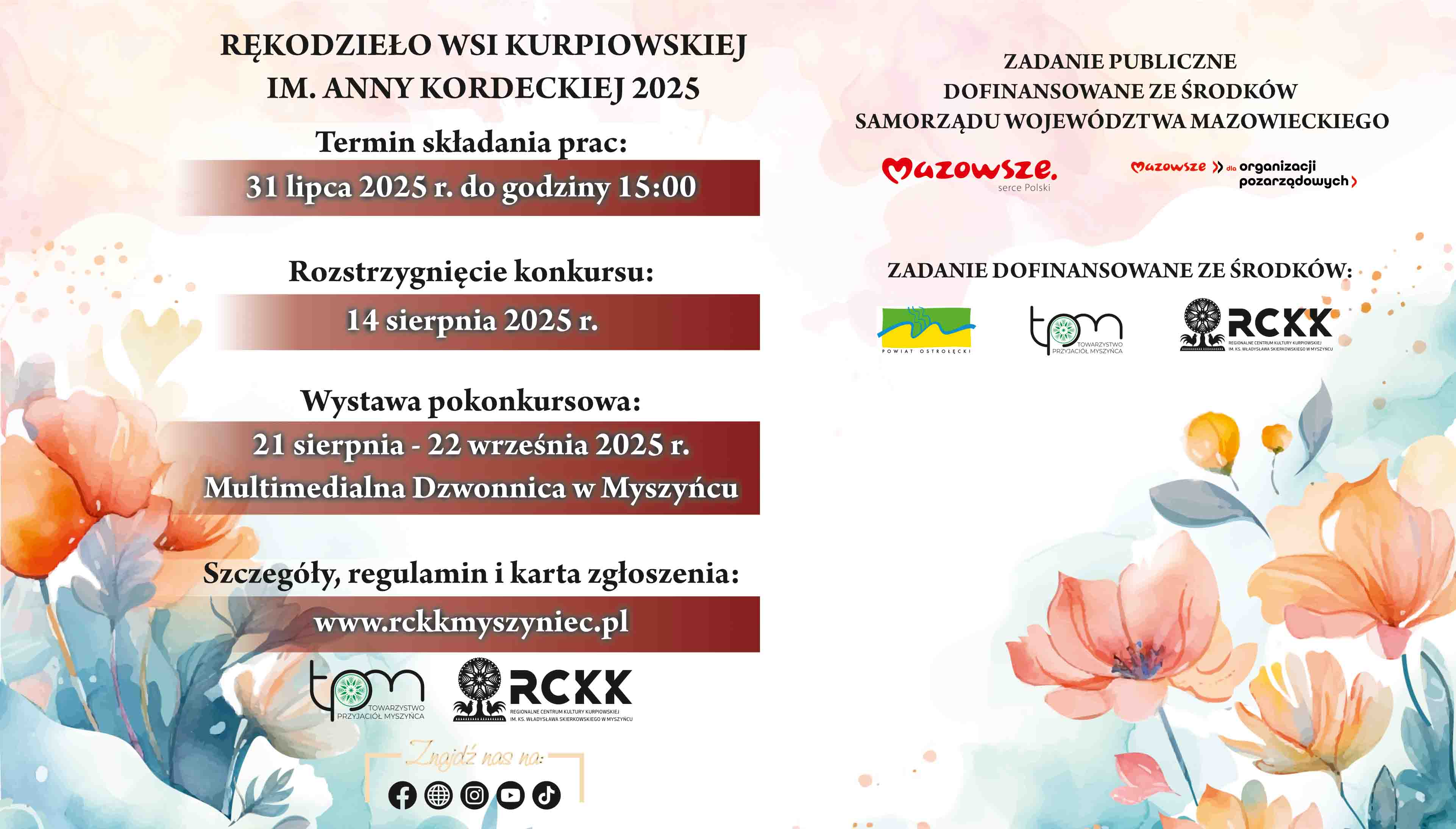 - Prace należy dostarczyć do RCKK w Myszyńcu do dnia 31 lipca 2025 r. do godz. 15:00.