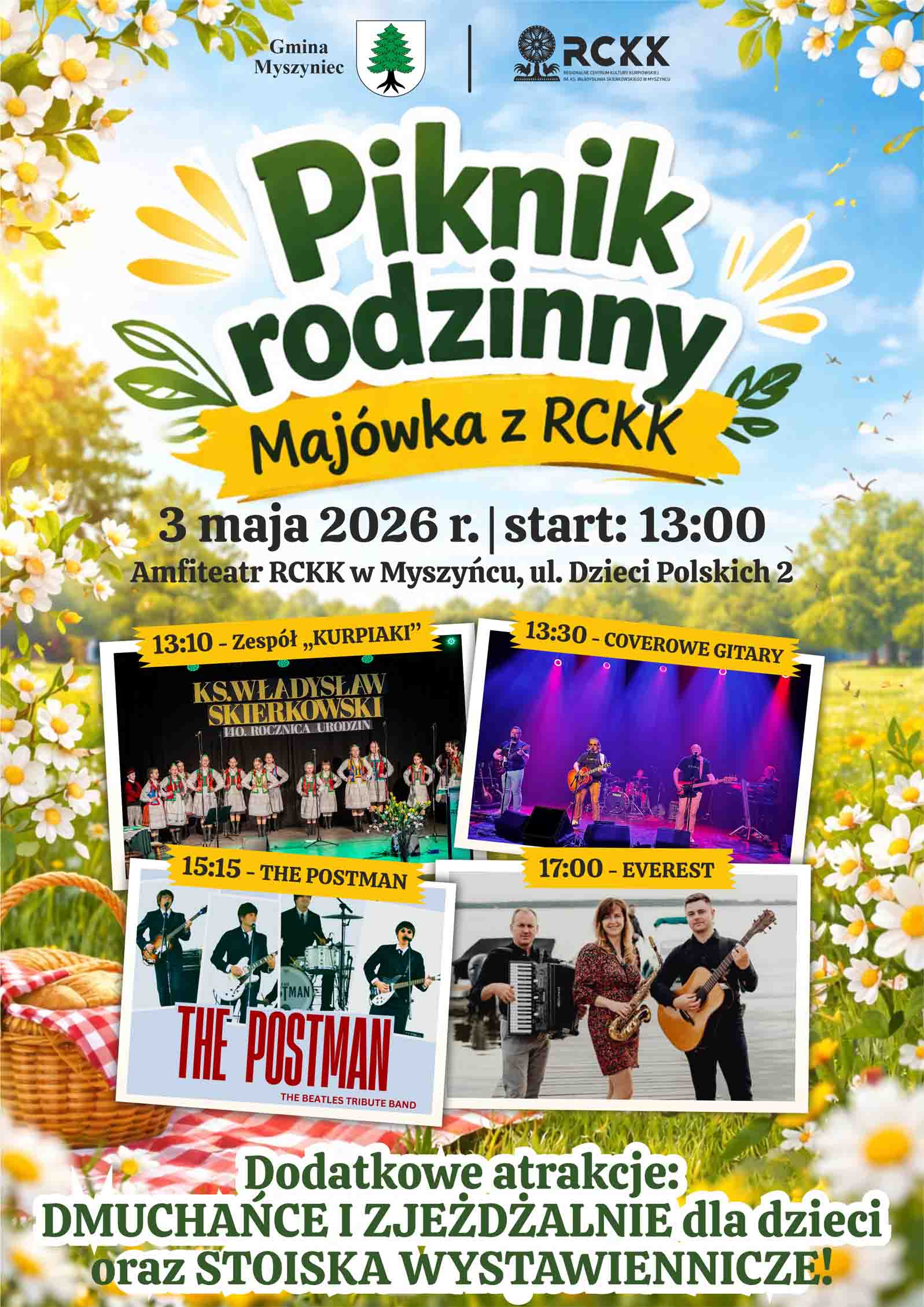 Zapraszamy na Piknik Rodzinny, który odbędzie się 3 maja 2026 r. w Amfiteatrze RCKK przy ul. Dzieci Polskich 2 w Myszyńcu.